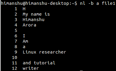 And suppose, we want nl to consider 8 consecutive empty lines to be one logical line for numbering. Then here's the command we'd run:
