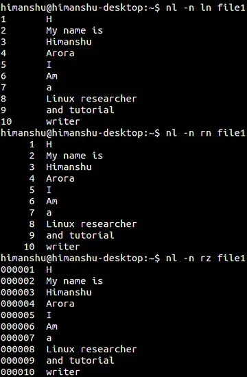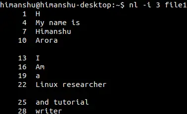 As already mentioned in the beginning, the nl command numbers lines in files. Following is its syntax: