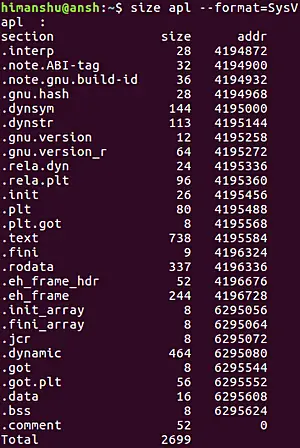 Basic usage of size is very simple. All you have to do is to pass the object/executable file name as input to the tool. Following is an example: