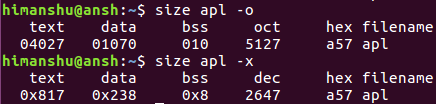 The first three entries are for text, data, and bss sections, with their corresponding sizes. Then comes the total in decimal and hexadecimal formats. And finally, the last entry is for the filename.