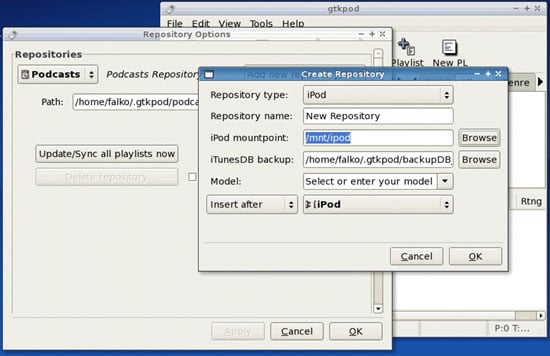 A new window named Create Repository comes up. First we tell gtkpod where our iPod got mounted, so we click on the Browse button right to iPod mountpoint: