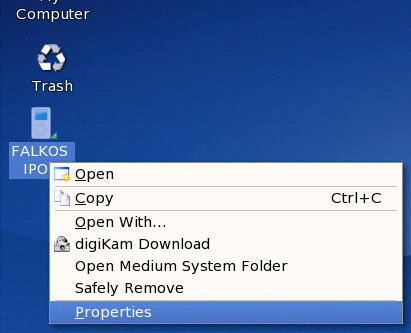 We need to find out about our iPod's mountpoint so that we can properly configure gtkpod later on. Right-click on the iPod icon on your desktop and select Properties: