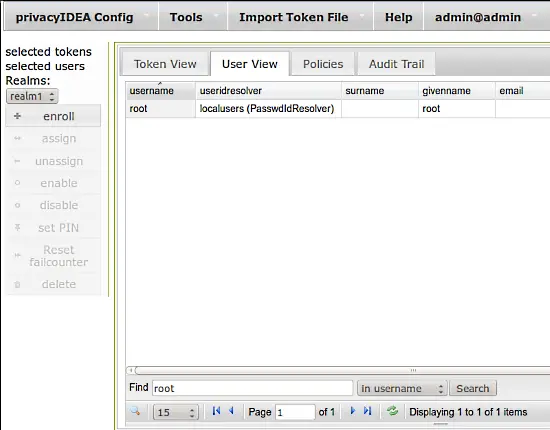 Select the user "root" by clicking on it and then click the button enroll on the left side to enroll a token to this selected user.