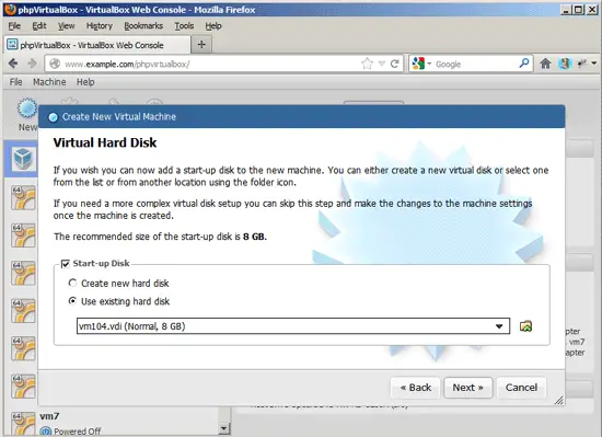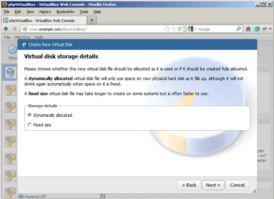 There's a little bug in the Create New Virtual Machine wizard I encountered in phpvirtualbox 4.1-8 (it works fine with phpvirtualbox 4.1-7, so I can't say whether this is a problem with 4.1-8 or nginx; I haven't tested 4.1-8 on Apache yet) - when you choose to create a new hard disk...