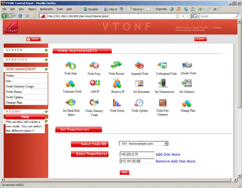 This is how the control panel looks. I will now describe the most important functions (although Vtonf is so easy to use that you'd most likely figure this out on your own). To create a new virtual machine, click on Create Node: