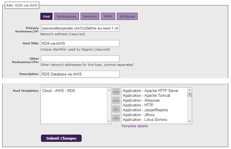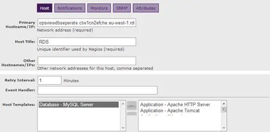 - Once you have your Opsview server connected to your RDS DB on port 3306 (i.e. MySQL and all derivatives henceforth), you can begin to monitor using the built-in "Database - MySQL Server" template in the software.