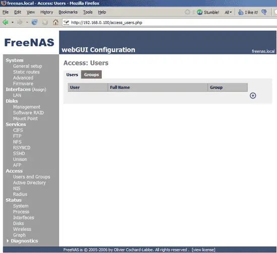 To create users, we must first create group to which we can add the users. Go to Access -> Users and Groups and then to the Groups tab and click on +: