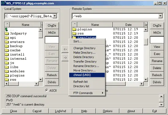 Next we must change the permissions of the /templates folder to 777 (chmod 777) (777 = Read, Write, Execute for Owner, Group, Other) like this: