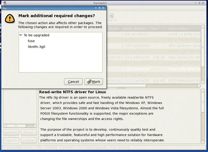 ntfs-3g has some required dependencies that must be installed as well; accept these packages by clicking on Mark.