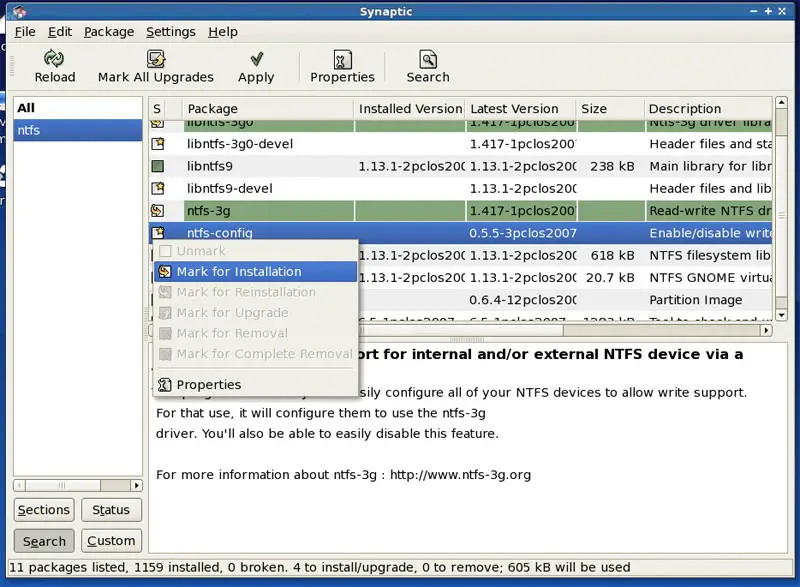 On the results page, click on the package ntfs-3g and select Mark for Installation: