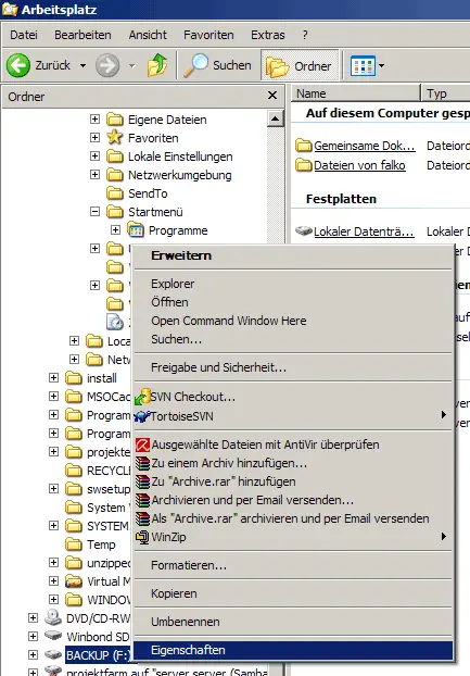 To fix this, we must boot into our Windows system again and plug in our NTFS drive. In the Windows Explorer, right-click on the drive and select Properties: