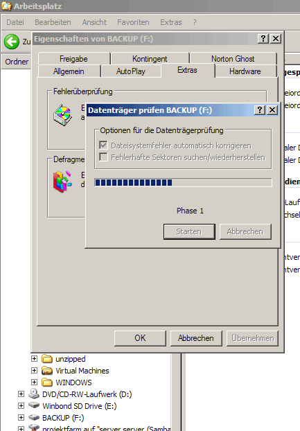 Then go to the Extras tab and select to check the drive for errors (it's the first button saying Jetzt prüfen... in this screenshot (I got a German Windows...)):