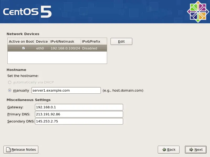 Set the hostname manually, e.g. server1.example.com, and enter a gateway (e.g. 192.168.0.1) and up to two DNS servers (e.g. 213.191.92.86 and 145.253.2.75):