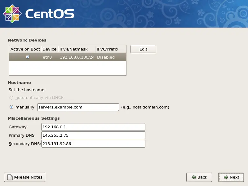 In this tutorial I use the hostname server1.example.com with the IP address 192.168.0.100 and the gateway 192.168.0.1. These settings might differ for you, so you have to replace them where appropriate.