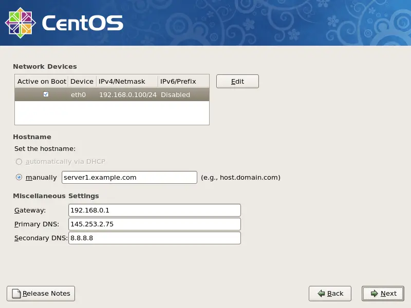 In this tutorial I use the hostname server1.example.com with the IP address 192.168.0.100 and the gateway 192.168.0.1. These settings might differ for you, so you have to replace them where appropriate.