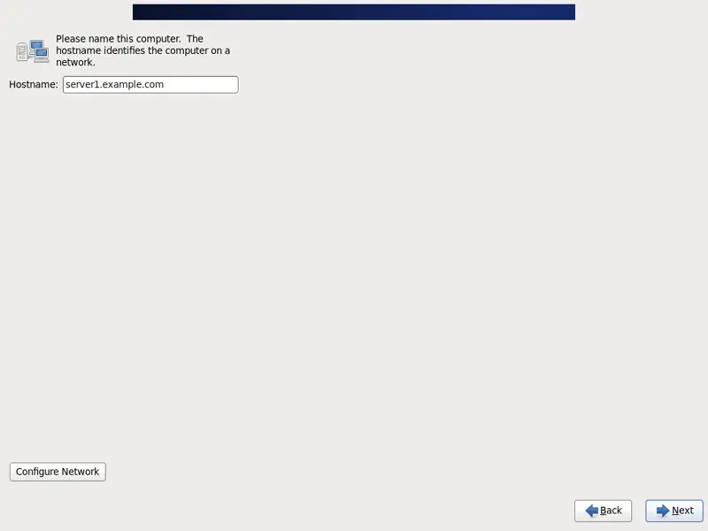 Fill in the hostname of the server (e.g. server1.example.com), then click on the Configure Network button: