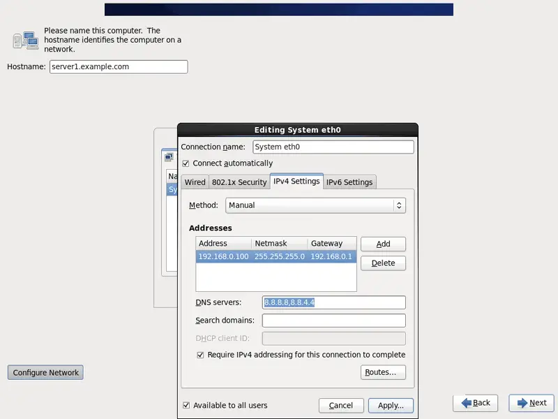 Fill in the hostname of the server (e.g. server1.example.com), then click on the Configure Network button: