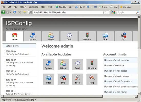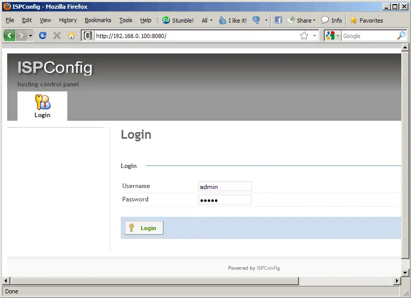 You can then access ISPConfig 3 under http(s)://server1.example.com:8080/ or http(s)://192.168.0.100:8080/ ( http or https depends on what you chose during installation). Log in with the username admin and the password admin (you should change the default password and possibly edit the admin username after your first login):