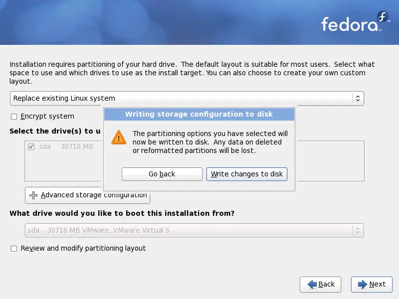 Next we do the partitioning. Select Replace existing Linux system. This will give you a small /boot partition and a large / partition which is fine for our purposes: