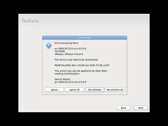 If you see the following message (Error processing drive: [...] This device may need to be reinitialized. REINITIALIZING WILL CAUSE ALL DATA TO BE LOST!), please click on Re-initialize: