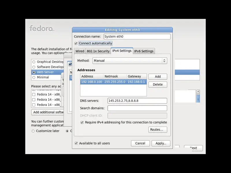 Now give your network card a static IP address and netmask (in this tutorial I'm using the IP address 192.168.0.100 and netmask 255.255.255.0 for demonstration purposes; if you are not sure about the right values, http://www.subnetmask.info might help you). Also fill in your gateway (e.g. 192.168.0.1); check the Connect automatically box and then click on the Apply... button: