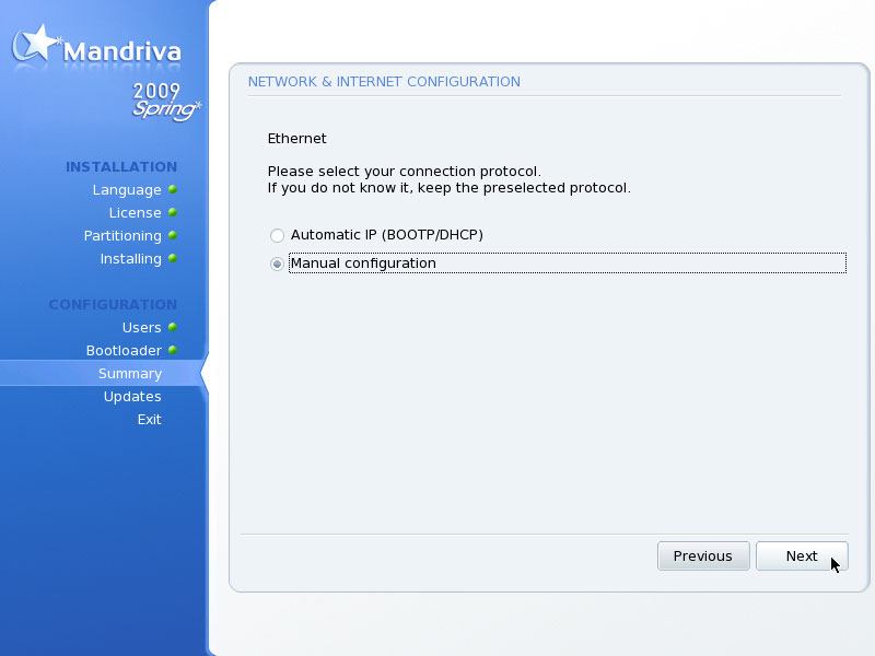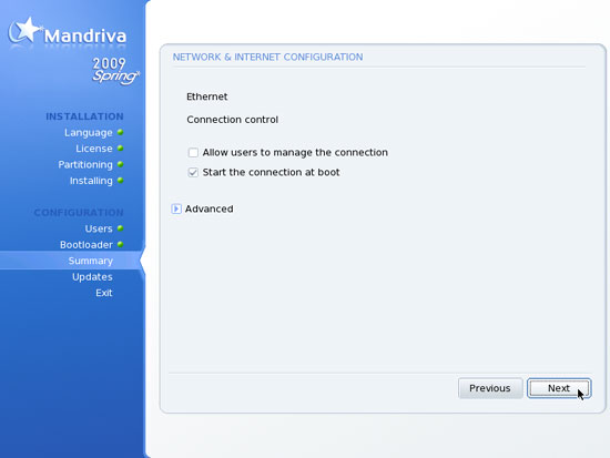 In my setup I got the message that the Internet connectivity test failed - I'm not sure if this is a bug in the Mandriva installer, or if there was a temporary problem with my Internet connection at that time; anyway, the Internet connection was working without any problems after the intitial installation, so if you see this message, don't let it fool you: