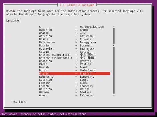 If you've selected an uncommon combination of language and location (like English as the language and Germany as the location, as in my case), the installer might tell you that there is no locale defined for this combination; in this case you have to select the locale manually. I select en_US.UTF-8 here: