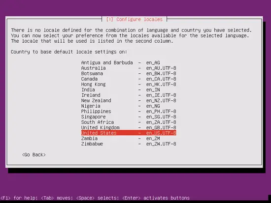 If you've selected an uncommon combination of language and location (like English as the language and Germany as the location, as in my case), the installer might tell you that there is no locale defined for this combination; in this case you have to select the locale manually. I select en_US.UTF-8 here: