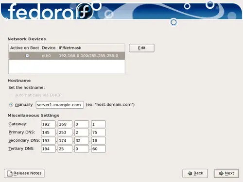 Set the hostname manually, e.g. server1.example.com, and enter a gateway (e.g. 192.168.0.1) and up to three DNS servers (e.g. 145.253.2.75, 193.174.32.18, and 194.25.0.60):