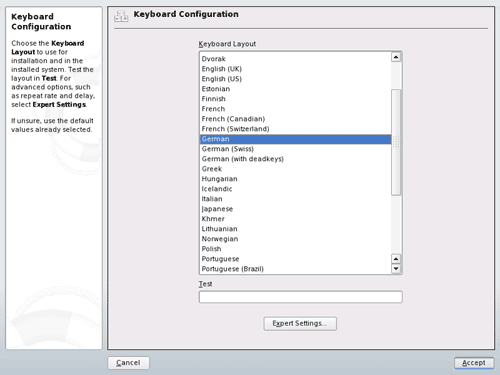 Now switch to Expert mode (the Expert tab in the Installation Settings), select your Keyboard Layout and Accept: