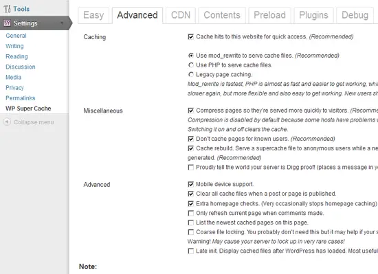 After you have installed and enabled WP Super Cache from your WordPress admin interface, go to Settings > WP Super Cache and then to the Advanced tab.