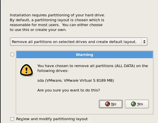 I'm installing CentOS 5.3 on a fresh system, so I answer Yes to the question Would you like to initialize this drive, erasing ALL DATA?