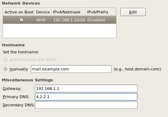 Set the hostname manually, e.g. mail.example.com, and enter a gateway (e.g. 192.168.1.1) and a DNS server (e.g. 4.2.2.1 ):