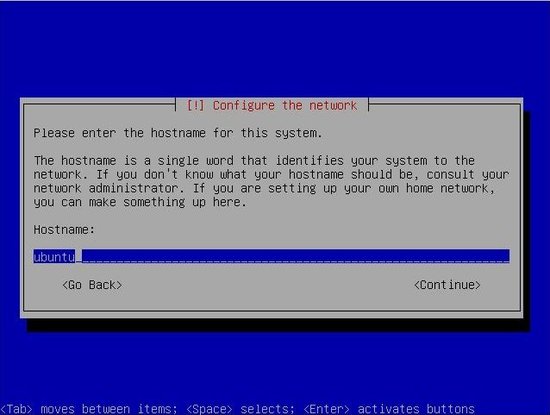 The Ubuntu installer will try to acquire an ip by DHCP; you'll change the ip address to a static one later. Next you will have to enter the hostname (you can use anything you want).