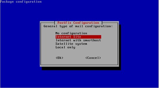 Next you'll have to choose your mail server configuration. Choose "Internet site" and type your domain name.