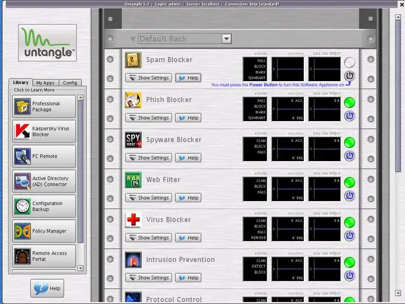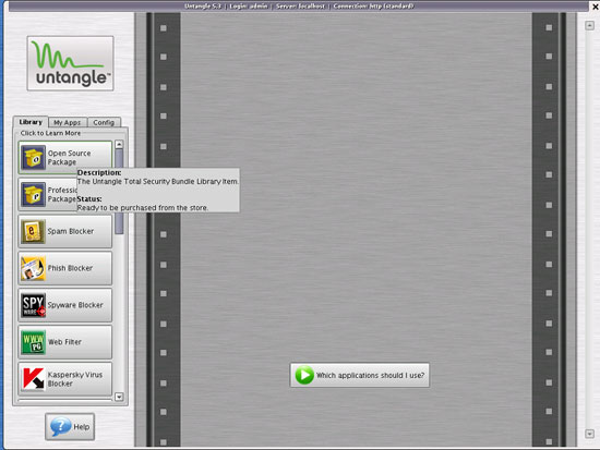 This is how the Untangle client looks. On the left you see a library of available add-ons on the Library tab, the already installed add-ons on the My Apps tab, and the current configuration on the Config tab. The main part represents a rack where the add-ons will be installed - just like in a data center where physical servers are installed in a rack.