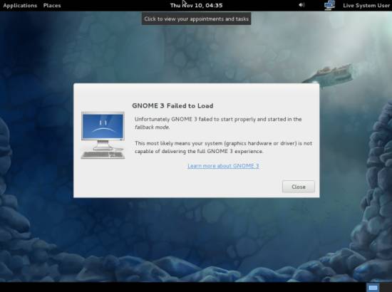 Download the Fedora 16 Live GNOME iso image from http://fedoraproject.org/en/get-fedora (e.g. http://download.fedoraproject.org/pub/fedora/linux/releases/16/Live/i686/Fedora-16-i686-Live-Desktop.iso), burn it onto a CD, and boot your computer from it. It will boot into a live Fedora 16 desktop that you can use to test how Fedora 16 works on your system. Fedora uses the GNOME 3 desktop by default, so if your hardware is not compatible with it, you will get following message: