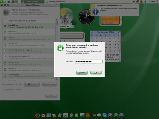 When you log in for the first time, you will most likely see a software update icon in the upper right corner (there should also be a pop-up originating from that icon saying that software updates are available) which means that updates for the installed software are available. To install the updates, click on that icon: