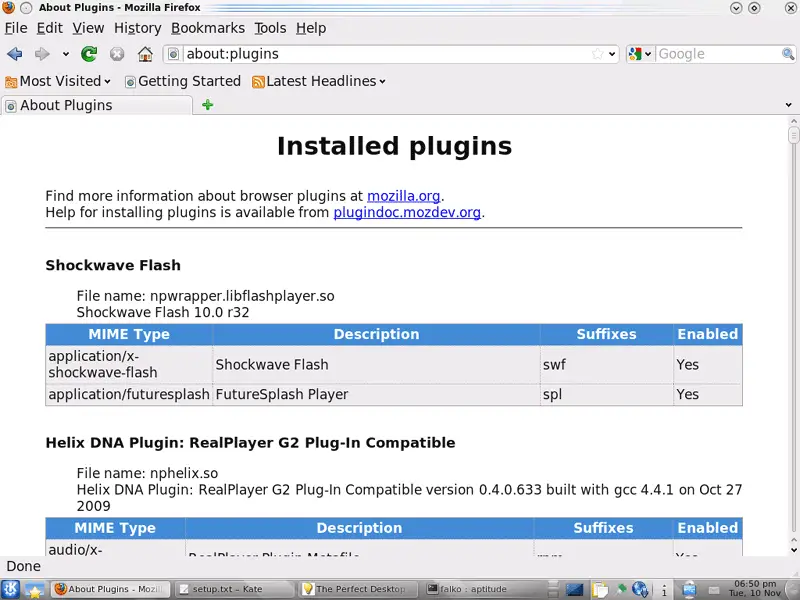 To see if the Flash Player has been installed correctly, open Firefox and type about:plugins in the address bar. Firefox will then list all installed plugins, and it should list the Flash Player (version 10.0 r32) among them:
