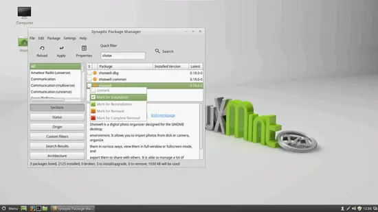 To select a package for installation, click on the checkbox in front of it and select Mark for Installation from the menu that comes up: