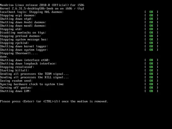 You will be asked to remove the Mandriva CD/DVD from the CD drive. Press ENTER once you've done this: