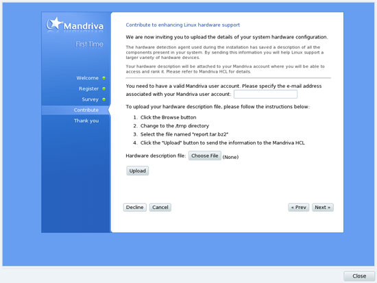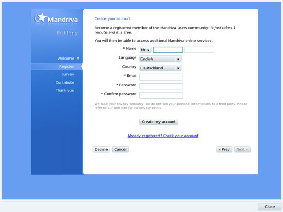 The First Time wizard comes up. You can use it to create an account with the Mandriva user community, answer a survey, submit your hardware details to Mandriva, etc. Click on Next:
