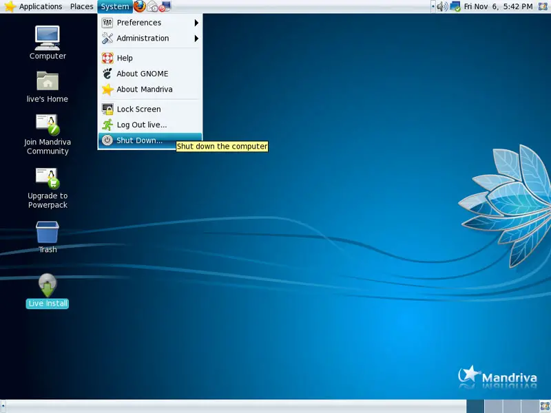 To use our new installation, we must reboot and remove the Mandriva CD from our CD drive. Log out of the current desktop session (System > Shut Down...), then select Restart from the upcoming menu: