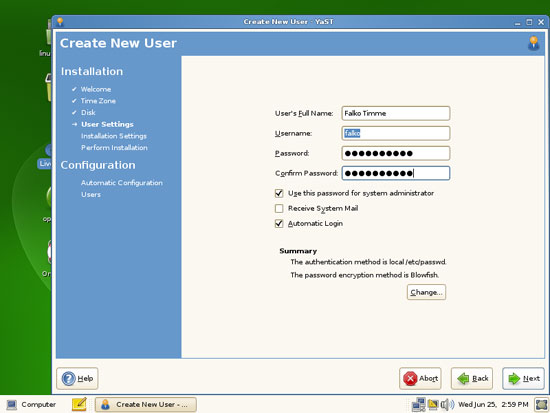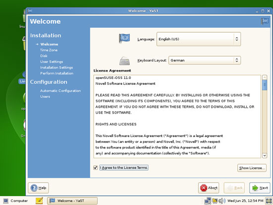 An OpenSUSE 11 image with default settings is now being copied to the hard drive: