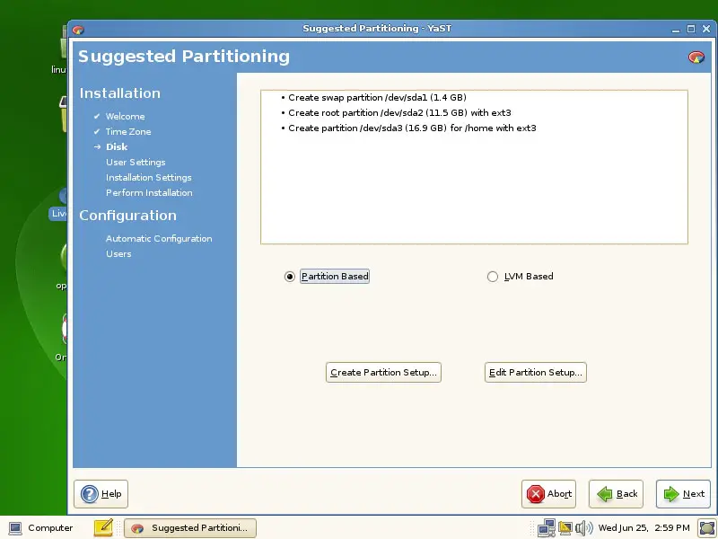 On the partitioning screen, you can either customize the partitioning, or you accept the default partitioning (which is also available as LVM - select LVM Based if you'd like to use the default partitioning with LVM):
