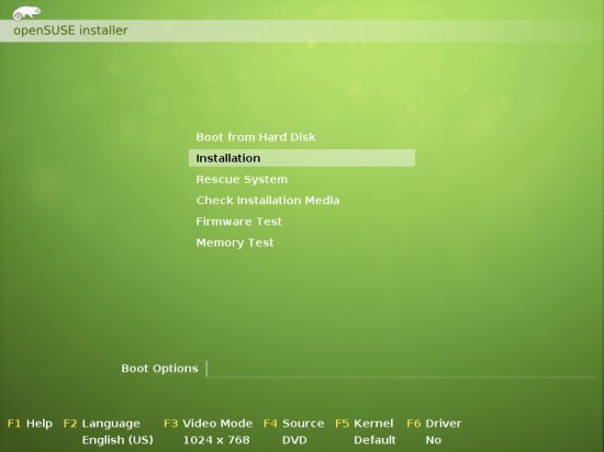 Download the OpenSUSE 12.2 GNOME Live-CD iso image, burn it onto a CD, and boot your computer from it. Select Installation.