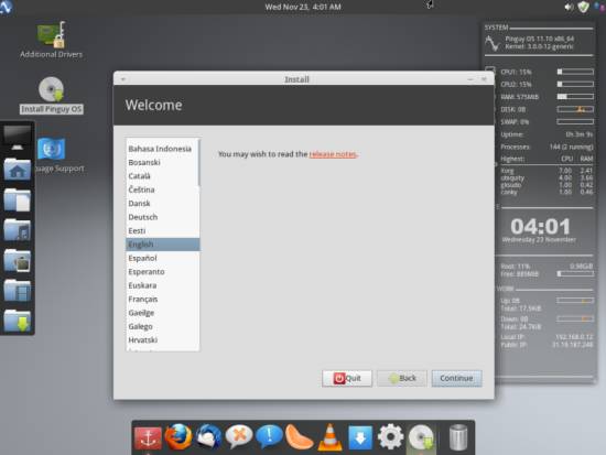 Double-click Install Pinguy OS to install the operating system on your hard disk. Select your language and click on the Continue button to start the installation: