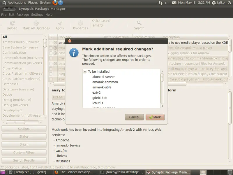 In the Synaptic Package Manager, we can install additional software. You can use the Quick search field to find packages. To select a package for installation, click the checkbox in front of it and select Mark for Installation from the menu that comes up: