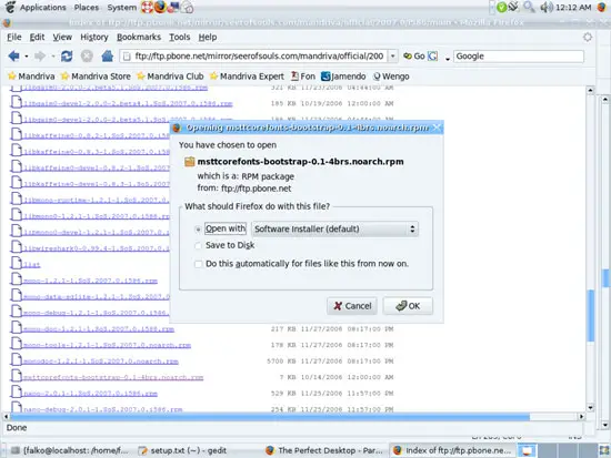 Open Firefox and download the file ftp://ftp.pbone.net/mirror/seerofsouls.com/mandriva/official/2007.0/i586/main/msttcorefonts-bootstrap-0.1-4brs.noarch.rpm. Select Open with Software Installer (default) in the Firefox download dialogue: