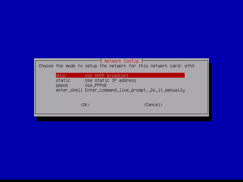 9. Next, select DHCP option to configure the network interface. In case the machine has multiple network interfaces, make sure you select the interface which is physically connected into the DHCP network. If you don't have a DHCP server configured at your premises, select the static option in order to manually add you network interface settings.